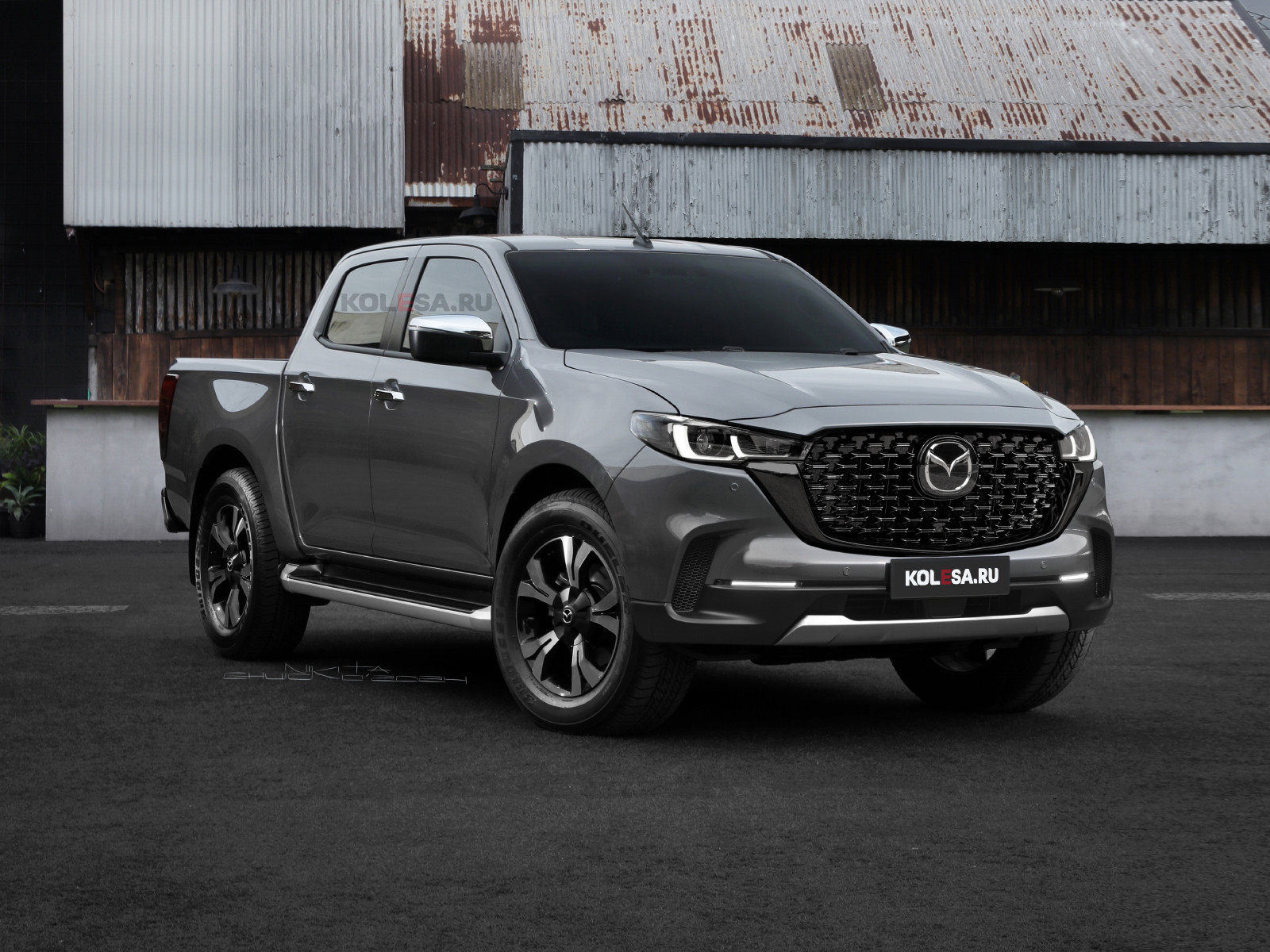 На этом тизере изображён лишь сильно затемнённый вид спереди, однако уже можно рассмотреть новые фары с графикой светодиодных огней, выполненных в стиле обновлённого кроссовера Mazda CX-5. Также виден существенно увеличенный логотип, вследствие чего можно предположить, что и решётка станет более крупной. Наверняка изменится и дизайн переднего бампера — мы изобразили один из возможных вариантов. Что же касается задней части, то в этой области производители пикапов обычно очень консервативны, и едва ли можно ожидать существенных изменений. Но мы всё же представили вариант с обновлённой графикой светодиодных габаритных огней, сделанной также в стиле современных кроссоверов компании.
