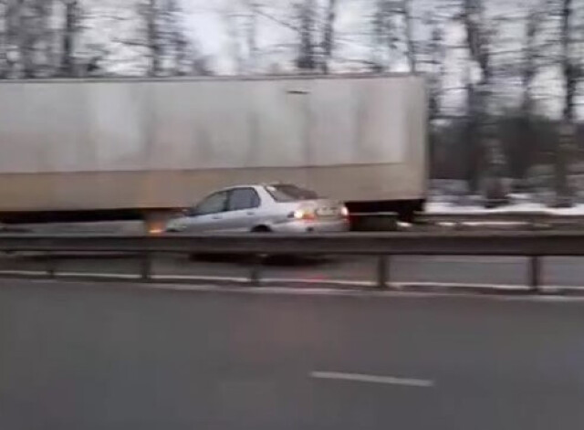 Один из очевидцев на камеру мобильного телефона запечатлел, как в скользящую по дороге фуру врезался Mitsubishi Lancer, а затем «Лада».