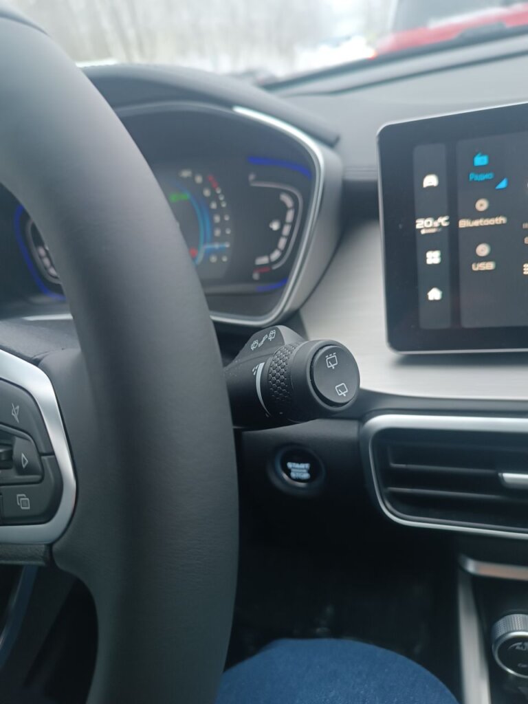 Кнопка включения заднего дворника расположена неудобно — прямо на конце рычага. Иногда случайно нажимается, что раздражает. Возможно, это дело привычки, но такое расположение кнопки кажется странным решением. На фото ниже видно, как реализована кнопка включения заднего дворника, а также включение противотуманных фар. На работающем двигателе невозможно полностью выключить фары — вместо этого загораются светодиоды, которые ярко светят в глаза. Это, вероятно, общая проблема для многих современных автомобилей, включая китайские. Такое неудобство особенно заметно в тёмное время суток, когда нужно маневрировать в тесных пространствах, не ослепляя окружающих. Например, когда забираешь ребёнка из детского сада, фары продолжают светить впустую, и их невозможно отключить, не заглушив двигатель.