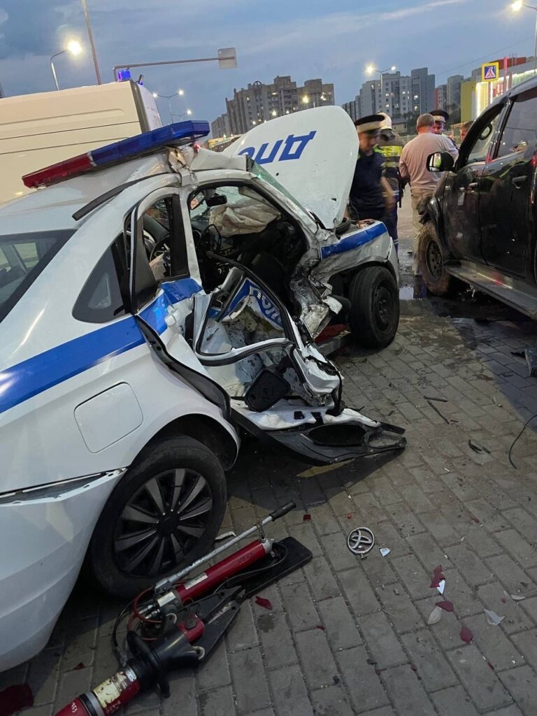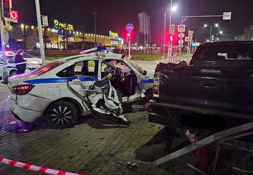 ДТП произошло 3 сентября в 19:55 на улице Псковской в Великом Новгороде. Водитель пикапа Toyota Hilux проехал на запрещающий сигнал светофора и совершил столкновение с патрульным автомобилем «Лада Веста», который двигался с включенной сиреной и мигалками.