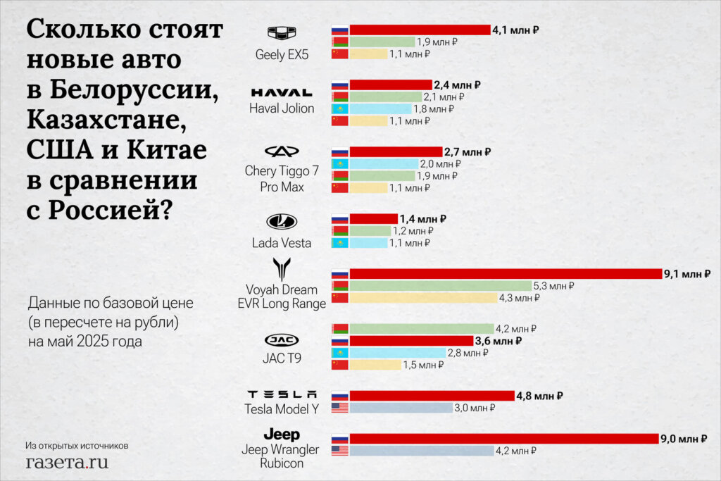 Например, популярный внедорожник Haval Jolion доступен в России по цене от 2,4 млн рублей, хотя в Беларуси он стоит 2,1 млн, а в Казахстане его можно приобрести ещё дешевле. У себя на родине, в Китае, этот автомобиль стоит около 1 млн рублей.