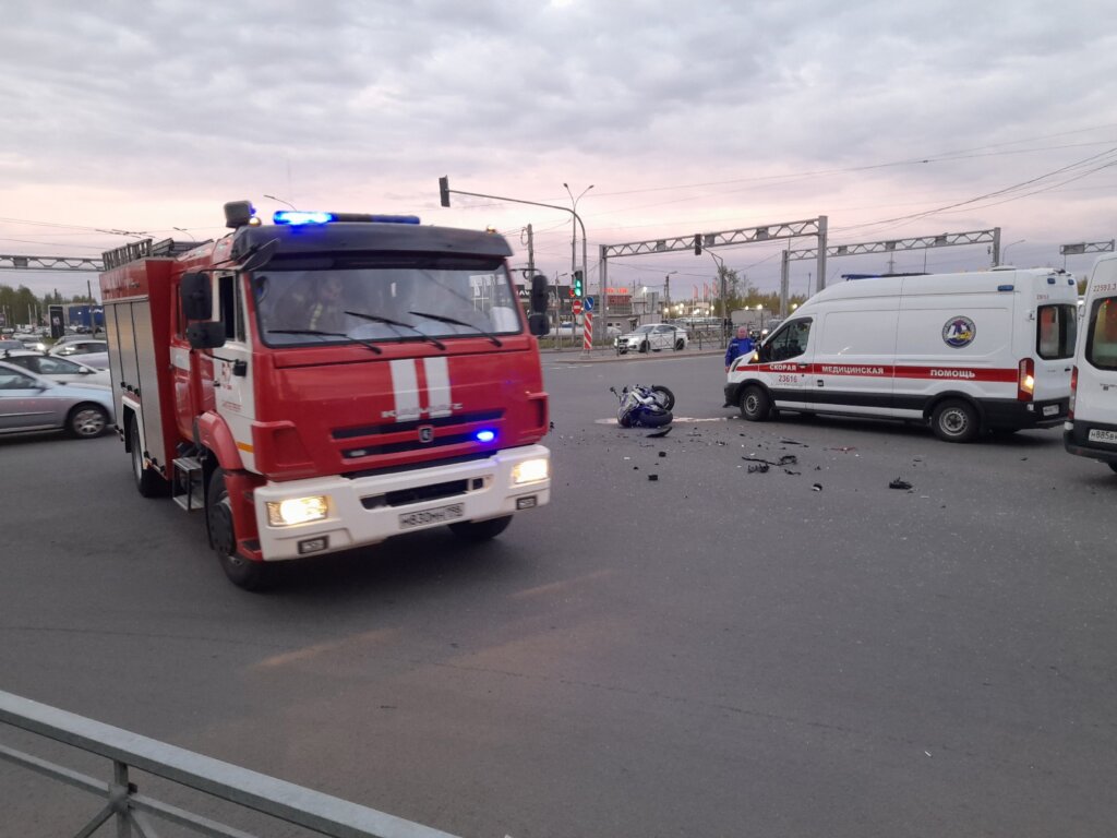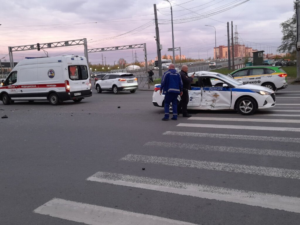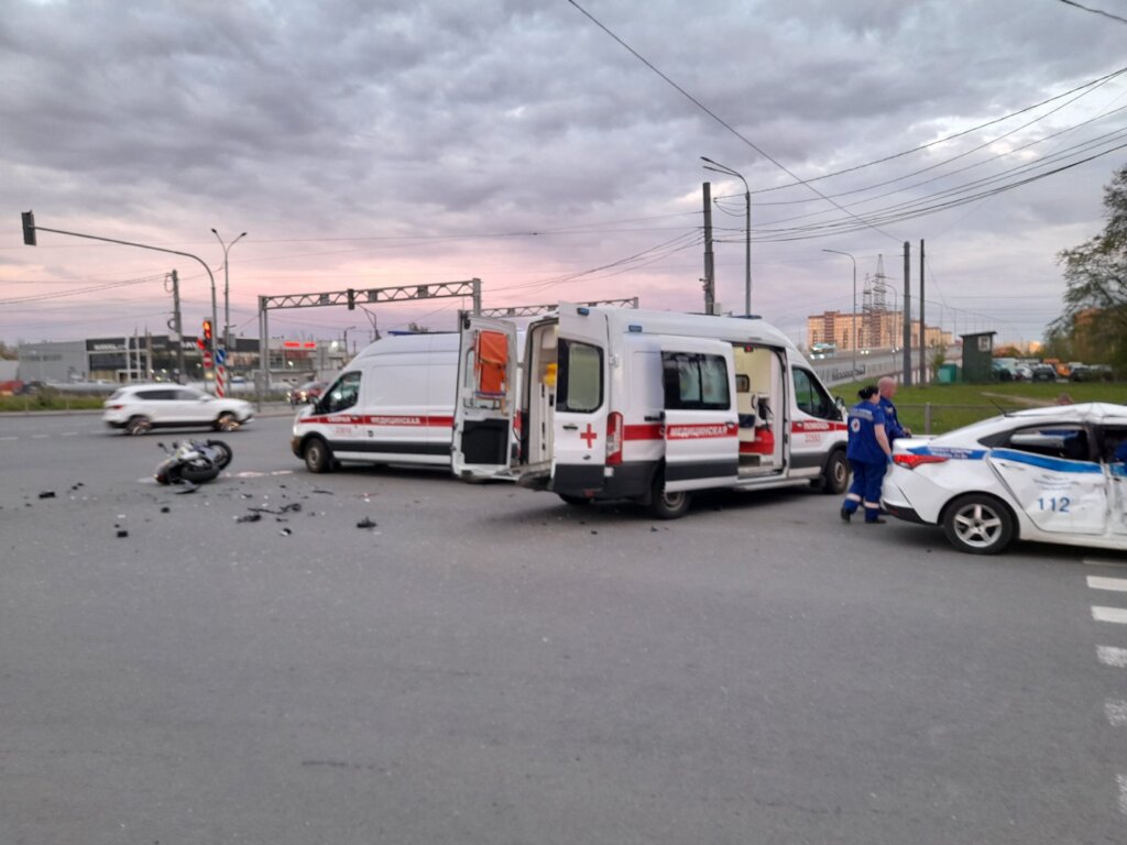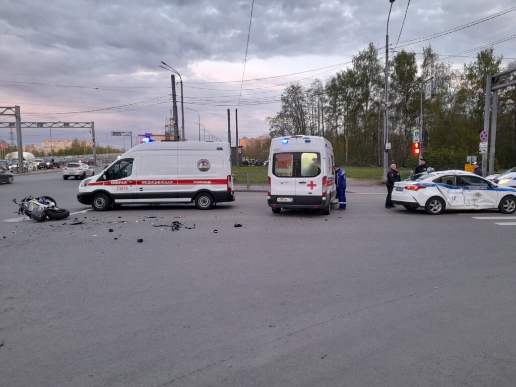 ДТП произошло 18 мая на пересечении Индустриального проспекта и улицы Хасанской в Санкт-Петербурге. Мотоцикл Suzuki столкнулся с полицейским автомобилем, который двигался с включенными спецсигналами.