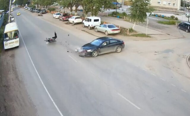 ДТП с мотоциклистом произошло на улице Кирова в Усть-Куте Иркутской области. От столкновения с автомобилем мотоциклист пролетел несколько метров, но смог сам подняться на ноги. Происшествие попало в объектив камеры уличного наблюдения.
