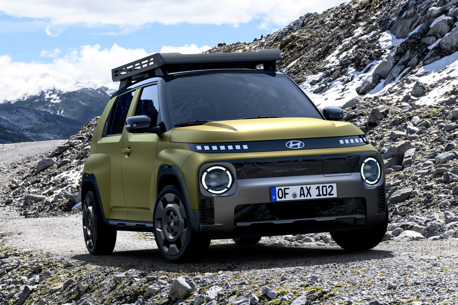 На фото: Hyundai Inster Cross Передние стойки, верх, а также корпуса наружных зеркал окрашены в чёрный, а на крыше находится массивный багажник. Отметим, объём «обычного» грузового отсека варьируется в диапазоне от 280 до 351 литра (в зависимости от версии). Длина Hyundai Inster Cross составляет 3825 мм. Для кросс-версии паркетника предложен особый цвет кузова Amazonas Green Matte, доступный наряду с остальной палитрой, доставшейся от «обычного» Hyundai Inster.