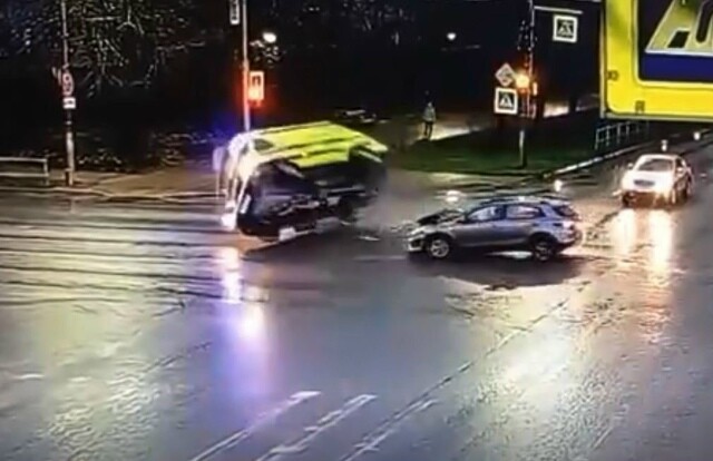 На пересечении улиц Воровского и Октябрьской в Кингисеппе Ленинградской области на перекрестке столкнулись скорая помощь и автомобиль Kia Rio. От удара скорая опрокинулась.