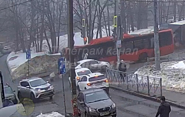 ДТП произошло в Казани на Мавлютова. Столкнулись такси и красный автобус. Происшествие попало в объектив камеры уличного наблюдения.