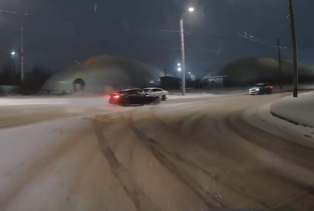 ДТП произошло на перекрёстке Хасанской и Коммуны в Санкт-Петербурге. Водитель темного седана на повороте ушёл в занос, выехал на встречную полосу и столкнулся с белой иномаркой. По словам автора, он остановился и отдал пострадавшему видео.