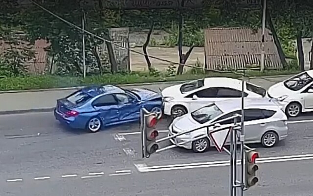 ДТП произошло во Владивостоке на ул. Вилкова. Водитель автомобиля Toyota Prius выехал на перекресток на запрещающий сигнал светофора и столкнулся с BMW, который от удара врезался во встречные Toyota Prius и Toyota Wish. Предполагаемый виновник утверждал, что выехал на перекресток на мигающий зеленый сигнал светофора.
