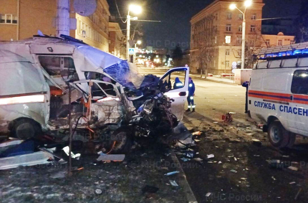 7 февраля в 1:50 ночи на пересечении проспекта Славы и улицы Попова в Белгороде 31-летний водитель автомобиля BMW Х7 проехал на запрещающий сигнал светофора и столкнулся с машиной скорой помощи, после чего оба автомобиля вылетели с дороги врезались в столб и стену здания.
