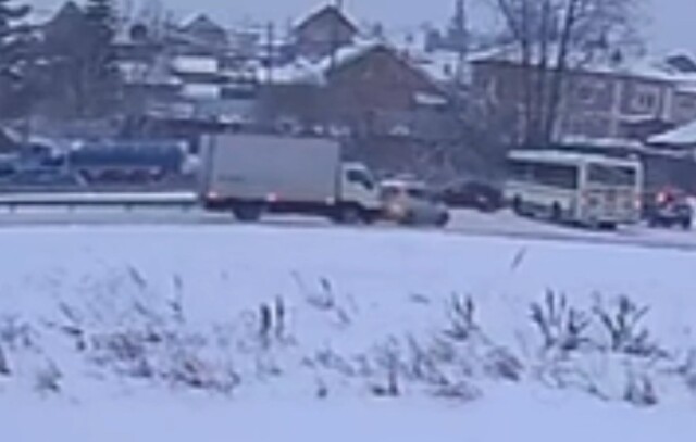 ДТП в Иркутске на объездной НЛО. Водитель легкового автомобиля пытался повернуть налево и столкнулся с грузовиком. От удара легковушку отбросило на автобус. Происшествие попало в объектив камеры.