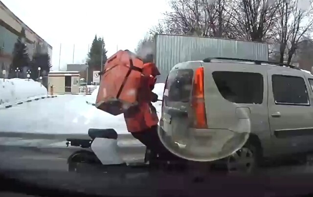 Водитель легковушки не заметил столкновения и уехал. Курьер тоже предпочел ретироваться. Момент ДТП попал в объектив видеорегистратора очевидца.
