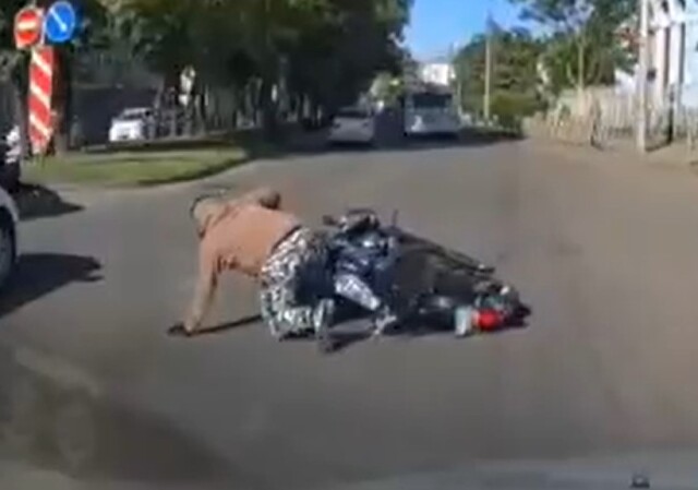 На Сормовской в Краснодаре байкер не удержал на дороге своего стального «коня» и оказался на асфальте. Происшествие попало в объектив видеорегистратора попутного автомобиля.