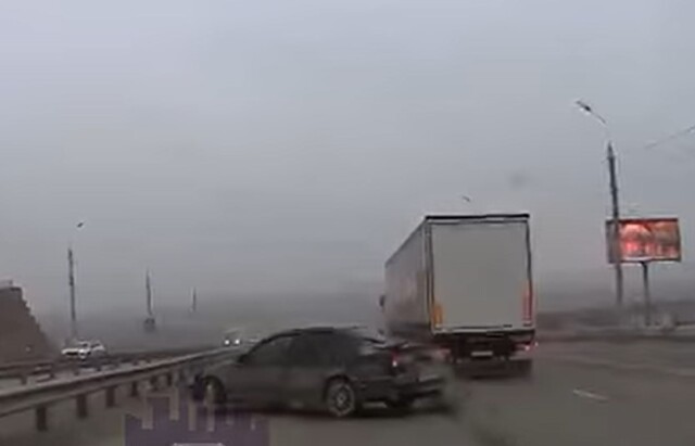 На Октябрьском мосту в Красноярске водитель большегрузной фуры при перестроении не заметил легковой автомобиль. От удара легковушку развернуло и отбросило на ограждение. Момент ДТП зафиксировал видеорегистратор двигавшейся следом машины.