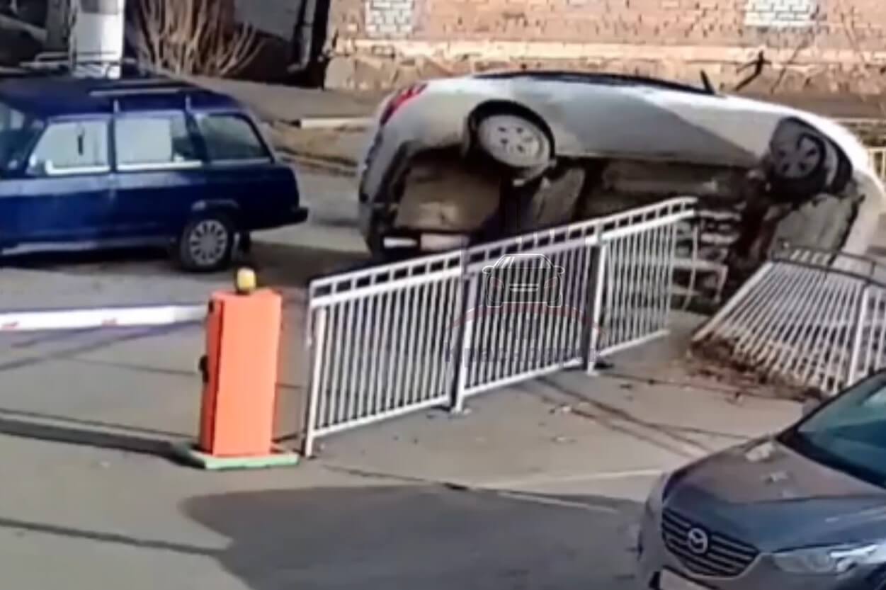 На улице Шелковой в Красноярске водитель наехал на ограждение и опрокинул автомобиль на бок. Происшествие попало в объектив камер уличного наблюдения.