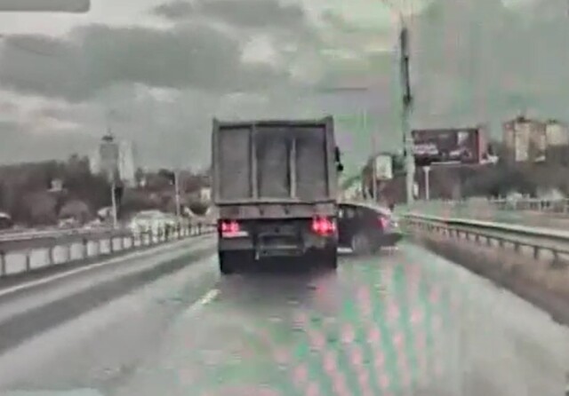 ДТП произошло на мосту Королёва в Могилёве. Водитель самосвала при перестроении не заметил легковой автомобиль и прижал его к отбойнику. Момент столкновения запечатлел видеорегистратор очевидца.