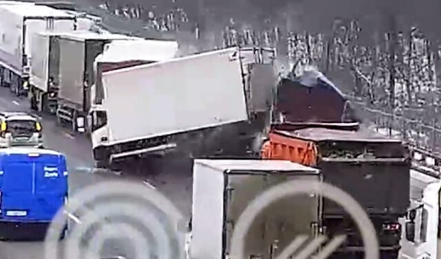 В объектив камер попал момент массового ДТП с участием грузовиков на МКАД