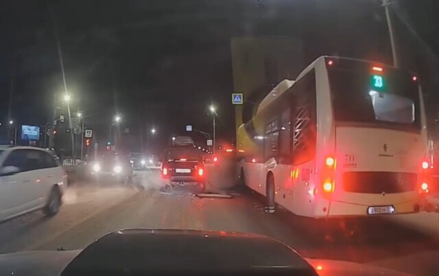 ДТП произошло перед перекрестком Энтузиастов — Химиков в Омске. Автобус въехал в стоящие на светофоре автомобили. Момент столкновения зафиксировал видеорегистратор попутного авто.