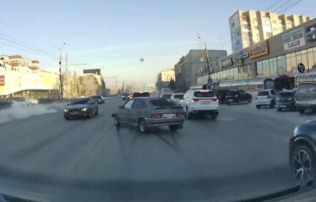 Авария случилась на Карла Маркса в Омске. Кроссовер перестраивался в левую полосу и столкнулся с «Ладой». Происшествие попало в объектив видеорегистратора попутного автомобиля.