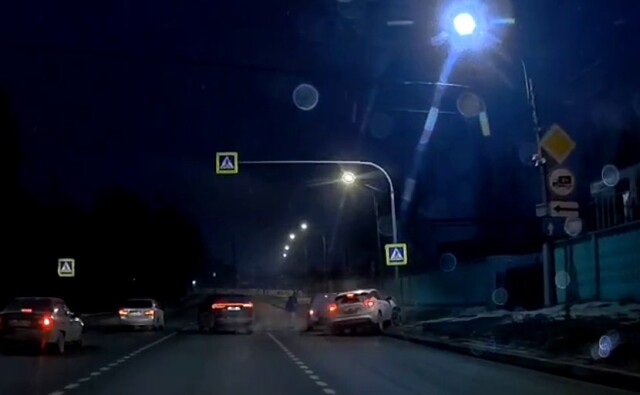 На улице Красина в Санкт-Петербурге водитель кроссовера не успел затормозить, врезался в столб и задел машину, которая пропускала пешехода.