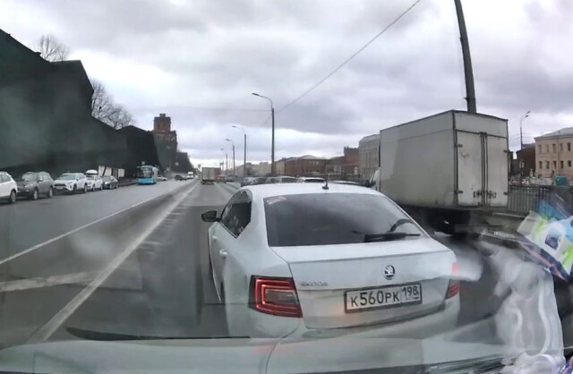 В Санкт-Петербурге водитель «Шкоды» обиделся, что автор ролика проехал прямо по левой полосе на перекрестке Обводного и Розенштейна, и решил отомстить. По словам виновника, там все поворачивают налево с двух полос.