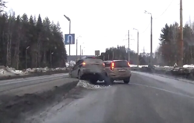 В Петрозаводске водитель кроссовера пытался развернуться с правой полосы и столкнулся с автомобилем, который двигался по левому ряду. Момент ДТП запечатлел видеорегистратор, установленный в салоне машины очевидца.