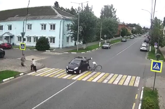 В Судогде Владимирской области женщина на велосипеде выезжала со второстепенной и столкнулась с автомобилем. Пострадавшую доставили в больницу. Момент ДТП попал в объектив камеры.