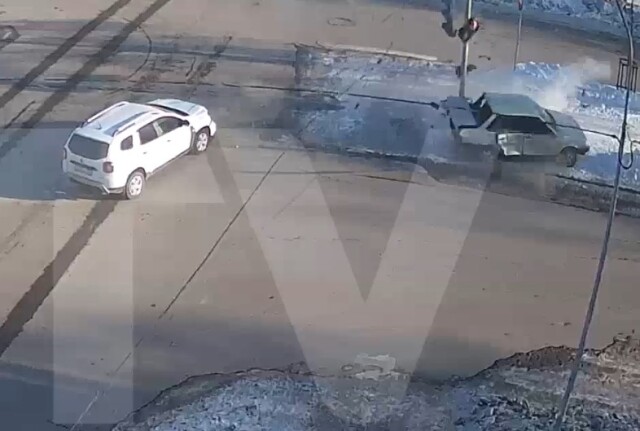 ДТП в Ишимбае (Башкирия). На перекрестке Ленина — Стахановская столкнулись ВАЗ-2199 и Renault Duster. От удара «Лада» врезалась в светофор. Происшествие попало в объектив камеры уличного наблюдения.