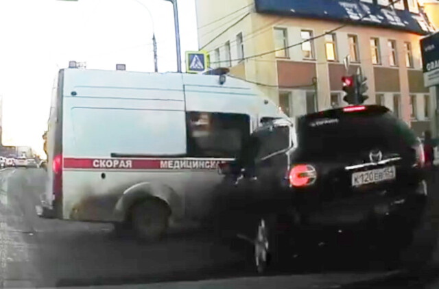 ДТП произошло в Новосибирске. На перекрестке улиц Фрунзе и Семьи Шамшиных водитель автомобиля Mazda CX-7 не пропустил скорую помощь. Момент столкновения зафиксировал видеорегистратор очевидца.