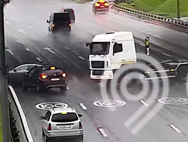 «Водитель тягача не смог затормозить»: камеры зафиксировали момент очередного ДТП на МКАД