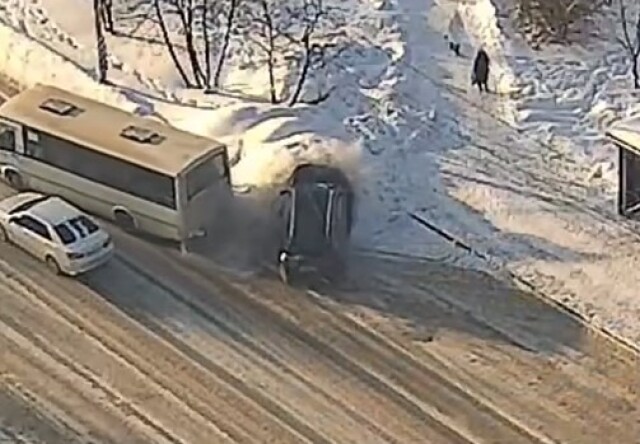 В Вологде автобус выезжал с остановки, и в него въехал автомобиль. Происшествие попало в объектив камер уличного наблюдения.