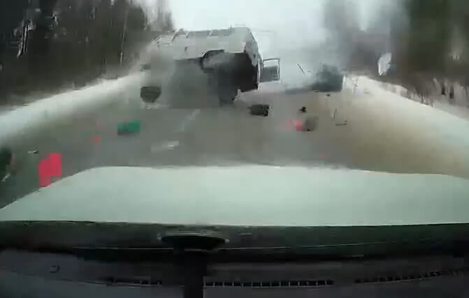 ДТП произошло 12 февраля днём на 1230 километре трассы «Золотое кольцо» в Калининском округе Тверской области. УАЗ столкнулся с автомобилем Chevrolet Lacetti. Момент столкновения попал в объектив видеорегистратора.